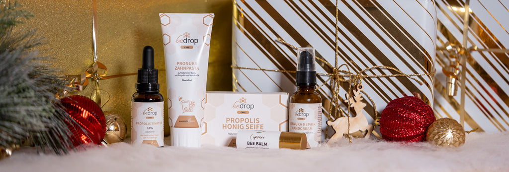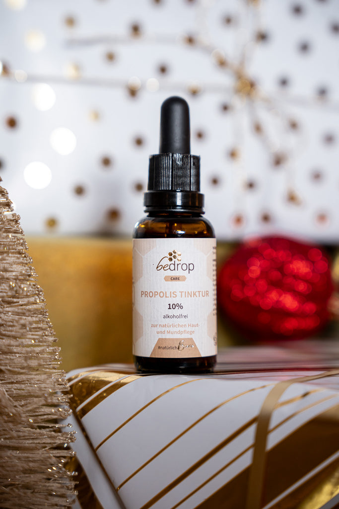 La propolis est le produit de l'abeille qui permet à la ruche de rester stérile et saine. Nous pouvons l'utiliser aussi bien pour notre bien-être que pour nos soins de la peau. Si tes proches souffrent par exemple de dermatite atopique ou d'acné, la teinture de propolis est une aide rapide pour les saisons froides. En même temps, c'est un soutien naturel pour le bien-être et un nez enrhumé.