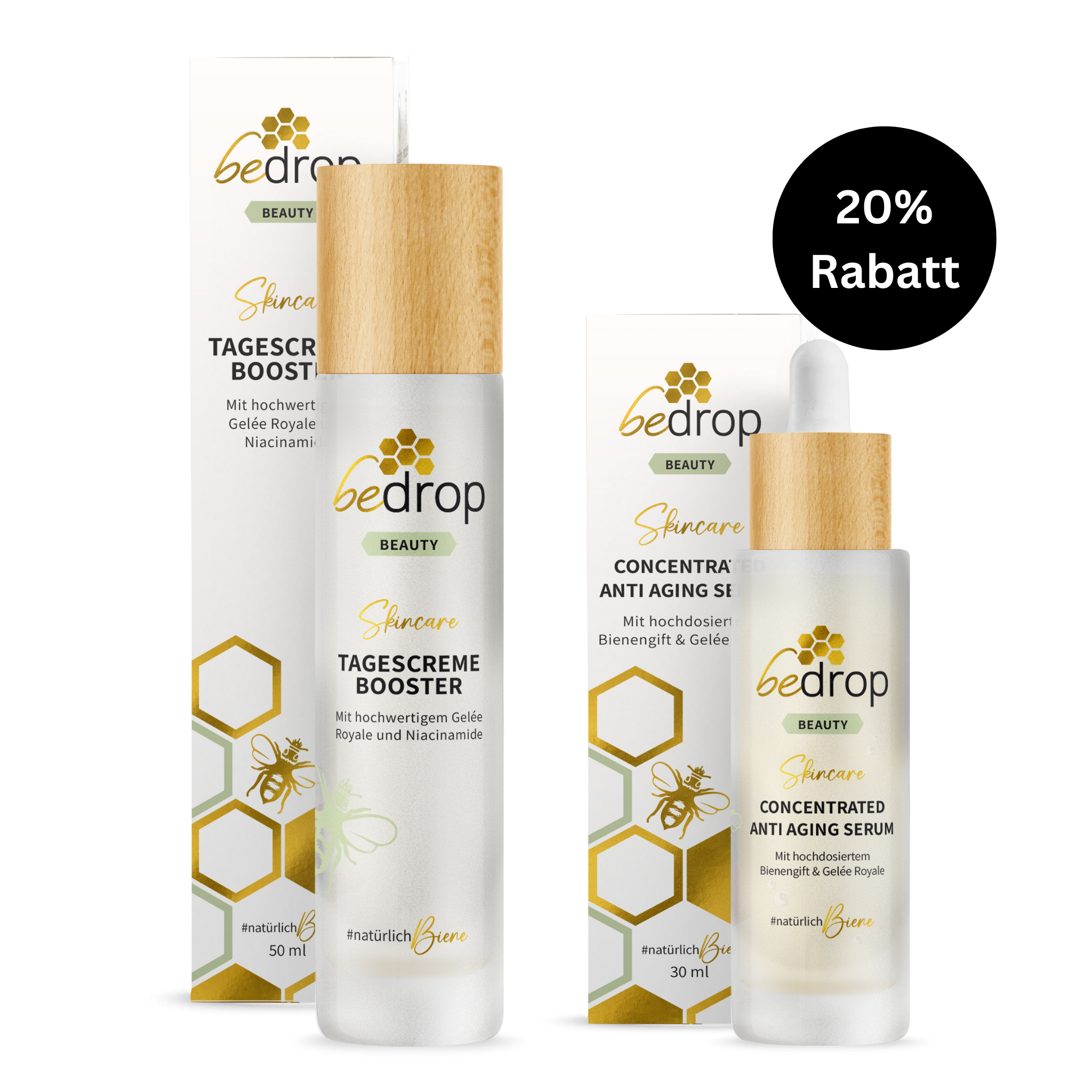 Das CONCENTRATED ANTI AGING SERUM und die Tagescreme von bedrop können dazu beitragen, feine Linien und Falten zu reduzieren und die Haut straffer und jugendlicher erscheinen zu lassen. Das enthaltene Bienengift ist bekannt für seine straffenden und revitalisierenden Eigenschaften, die die Haut glatter und ebenmäßiger machen können. Zusätzlich enthält das Serum feuchtigkeitsspendende Inhaltsstoffe wie Hyaluronsäure, die die Haut praller und strahlender erscheinen lassen.