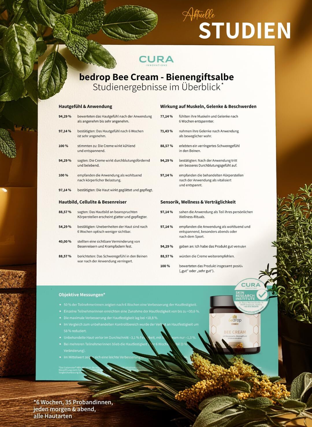 Die Bee Cream mit hochdosiertem Bienengift und natürlichen Kräuterextrakten wurde über mehrere Wochen getestet – mit durchweg positiven Rückmeldungen zu Hautgefühl, Wohlbefinden sowie der Anwendung bei Muskeln, Gelenken und Beinen.