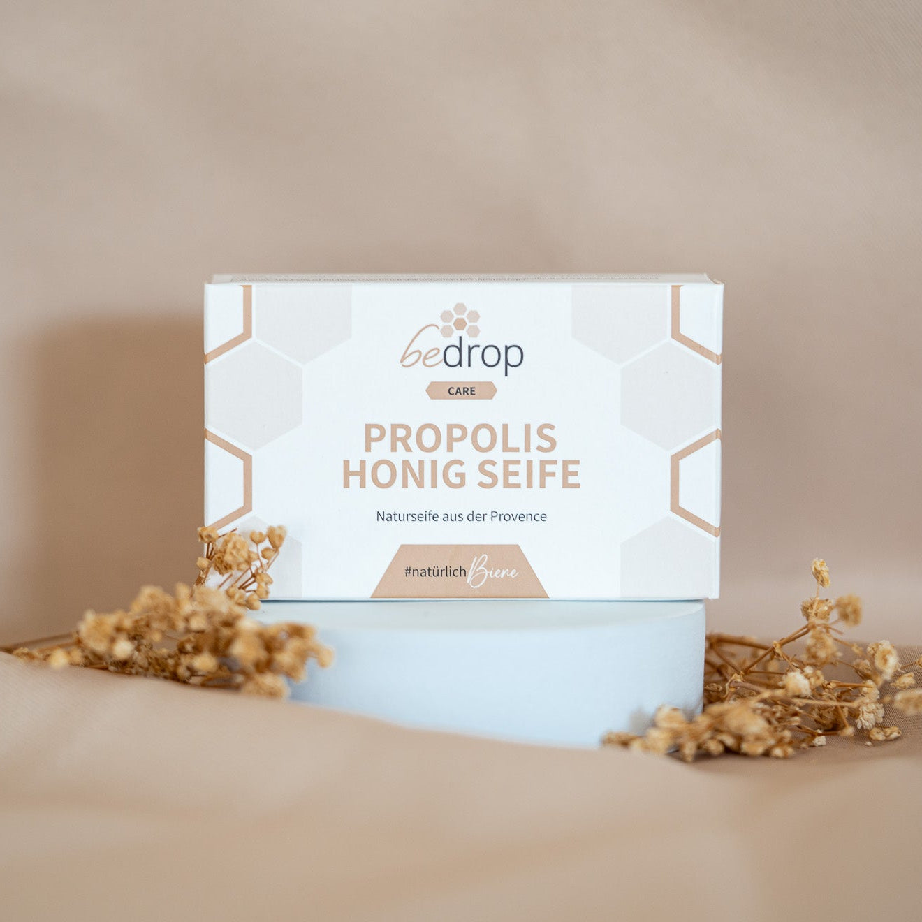 Unsere 100 % natürliche Propolis-Honig-Seife vereint Propolis, Lavendelhonig, Sheabutter, Oliven- und Kokosöl zu einer hochwertigen Pflegeformel. Die schnell schäumende Seife reinigt gründlich und sorgt für ein sauberes, geschmeidiges Hautgefühl. Das enthaltene Propolis unterstützt die Regeneration bei Hautirritationen und eignet sich auch für empfindliche Haut, wie sie bei Dermatitis vorkommen kann.